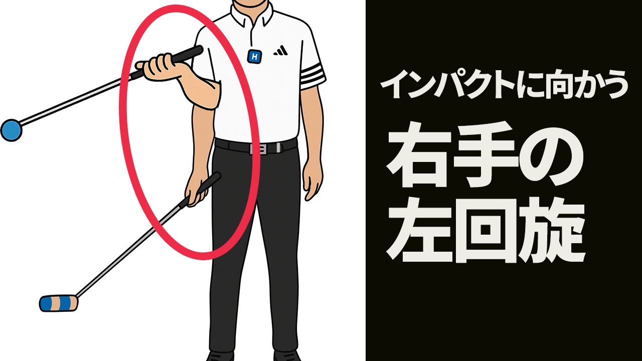 今回は『右腕は「右回旋→左回旋に切り替えて」インパクトに向かう|投げ縄状態での腕の回旋の切り替えについて』のゴルフレッスン動画です。