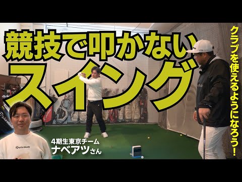 競技で80台前半のスコアを出したいという4期生の中原さんですが、三觜プロは「そのスイングじゃ叩きます」と厳しい判断。競技でスコアを作れるスイングとはどういうものなのか!?